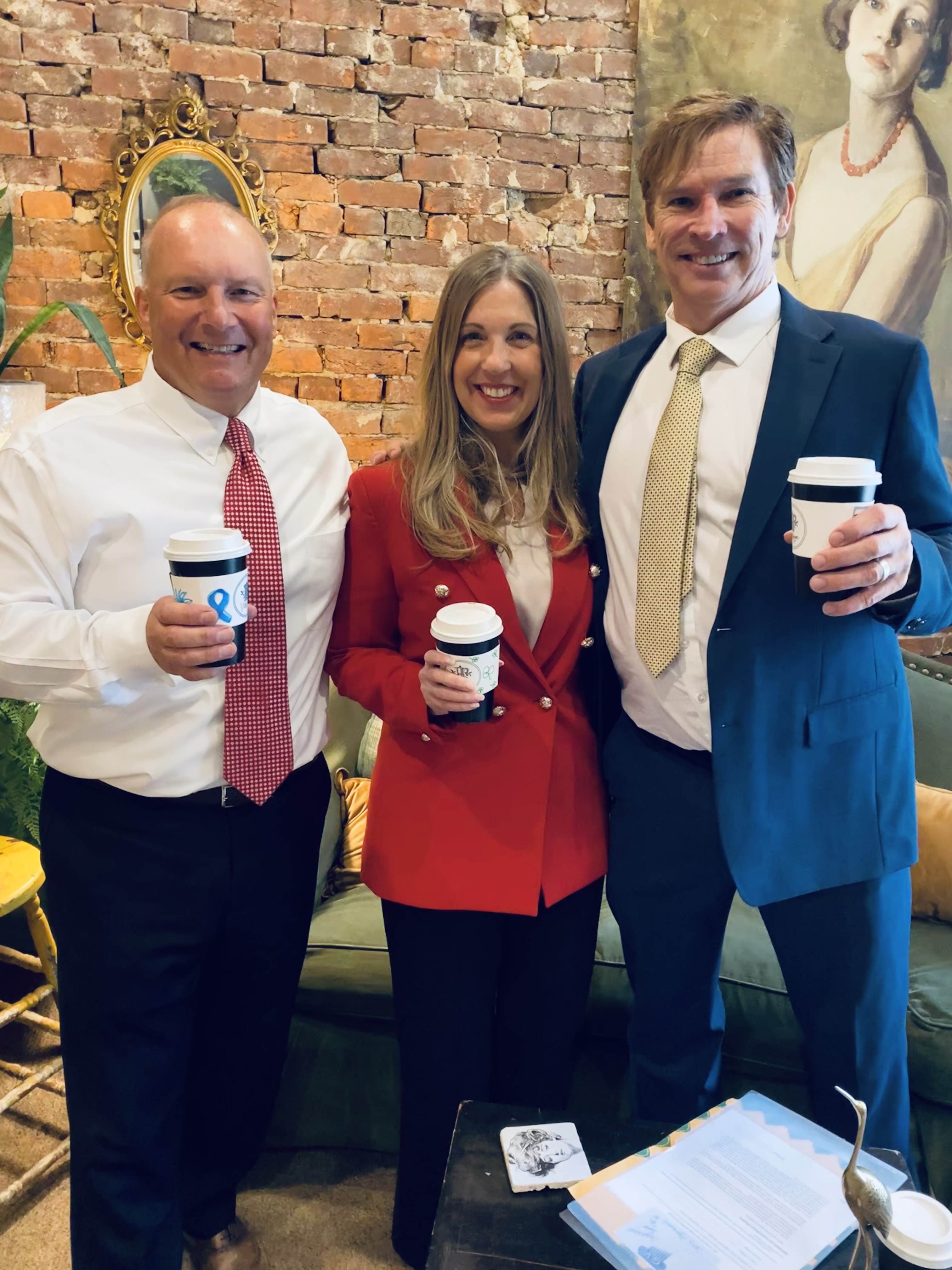 Attorneys Jen GV and Gary Vanasdale standing with their client celebrating a big win after court on April 2, 2025
