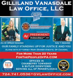 For more than twenty years in business, Gilliland Vanasdale Law Office, LLC has been named to the Pittsburgh 100 list of companies three years in a row and voted “Best Attorney” by the readers of the Butler Cranberry Eagle in the first-ever Community Choice Award.