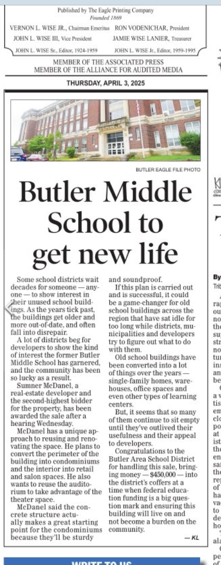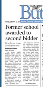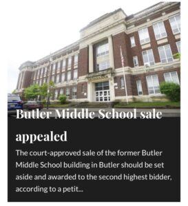 We successfully represented our client in his petition to set aside the sale of our Butler Area beloved middle school (former junior high and even senior high school to some) and its property proving that in accordance with the law our client was the rightful and just bidder.