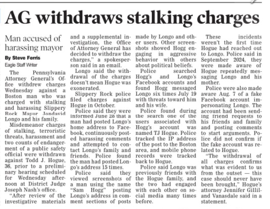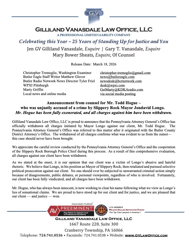 We won justice for our client who was wrongfully accused by a local small town Mayor in Slippery Rock, PA.